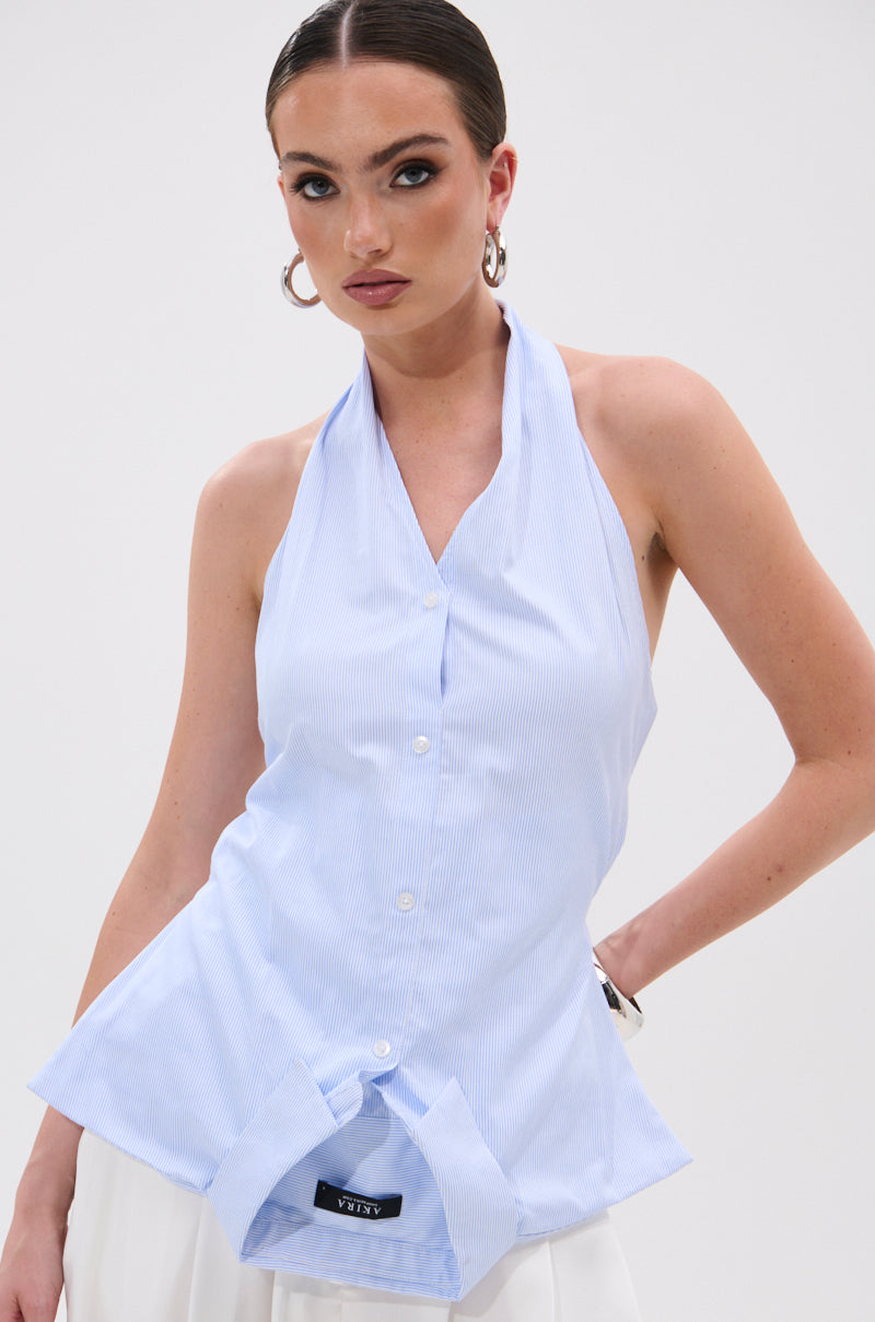 The AKIRA Label Tina Stripe Poplin Blouse is a chic twist on classic shirting. Crafted from crisp. lightweight pinstriped poplin. this halter-style blouse features a plunging neckline and a structured bodice that contours the waist for a cinched silhouette. a flipped design with a pointed shirt collar at the bottom hemline. and a button-up front. Complete with an exposed back and panels of self-tie closures. Style with linen pants and kitten heels for a polished. femme finish.