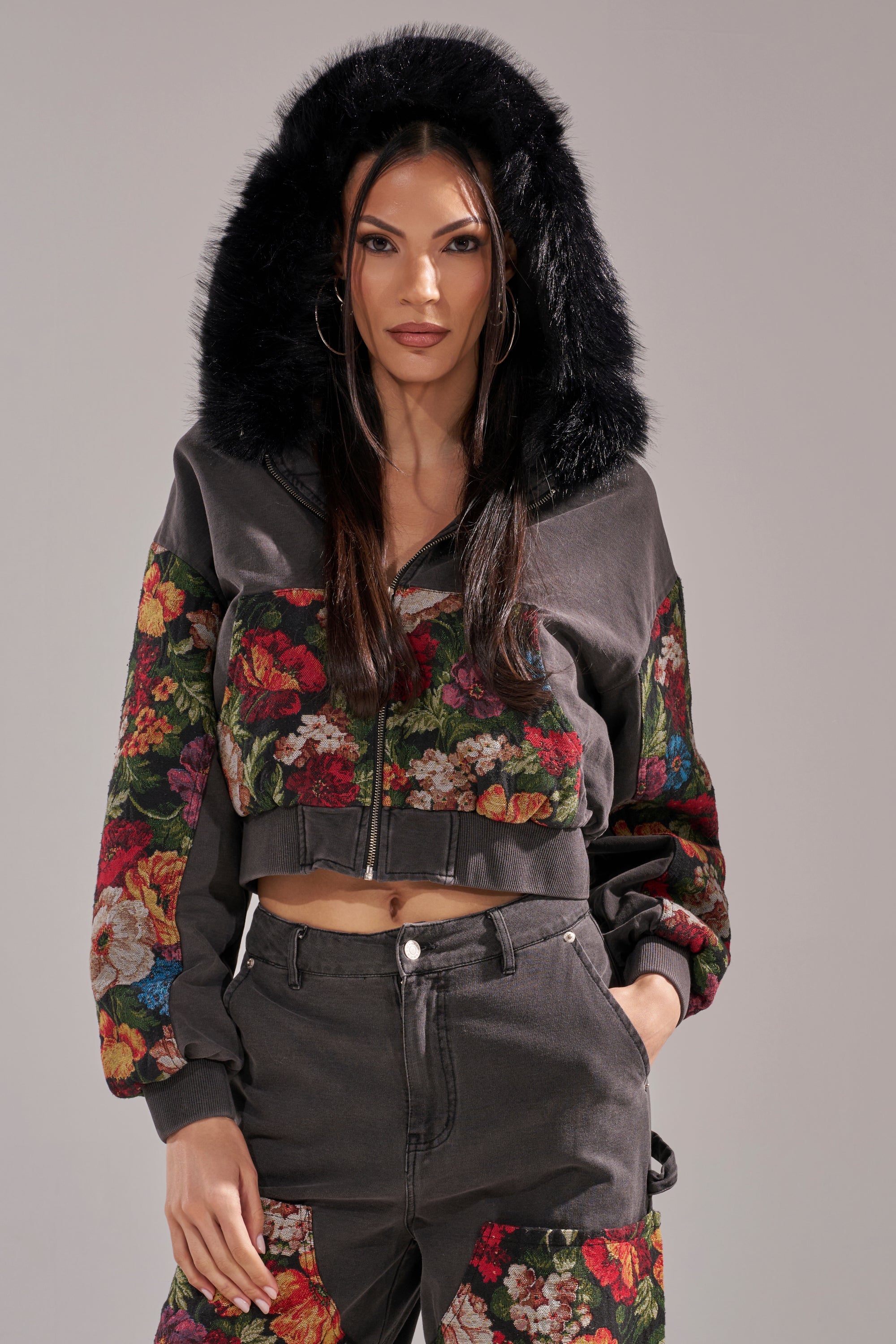 The AKIRA Label Try Me Floral Denim Zip Up Sweatshirt combines cozy streetwear with luxe texture. Crafted from soft washed charcoal fabric. this hoodie features vivid floral tapestry panels across the chest and sleeves for a striking contrast. A plush faux fur-trimmed hood adds warmth and drama. while ribbed cuffs and hem provide a snug. cropped fit. Pair it with the matching floral denim pants for a bold. coordinated set that's equal parts cozy and statement-making.