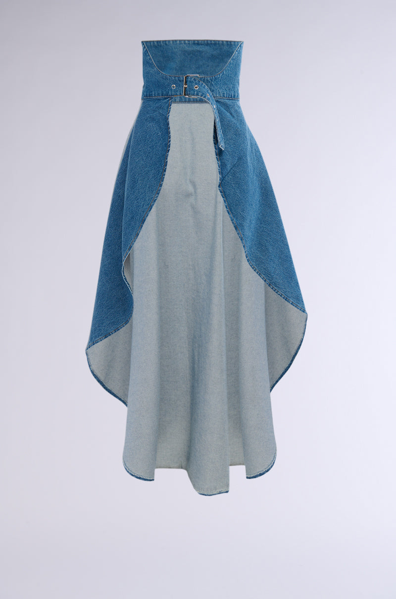 The AWNIS Label Walk On The Wild Side Denim Waist Belt is made from a cotton base denim fabrication and features a wide band base. a silver metallic buckle closure. and an attached long skirt train. Sits atop the waist for a cinched look