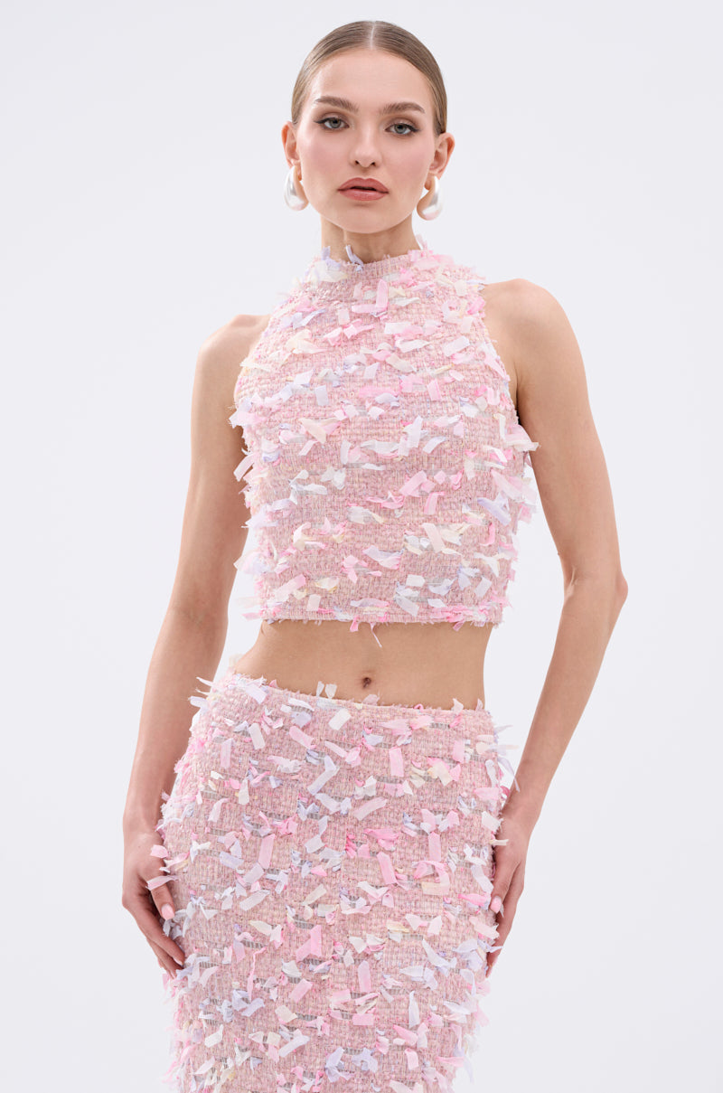 Let loose in The AKIRA Label Wild And Free Fringe Blouse. Crafted from a stretchy. textured mesh. this sweet top boasts a mock neckline. a sleeveless design. a self-tie panel lining the back. and covered in dimensional. pastel fringe detailing. Complete with a snug. cropped silhouette. Style it with the coordinating AKIRA Label Wild And Free Fringe Maxi Skirt. platform sandals. and pearl accessories for an adorable. femme finish.