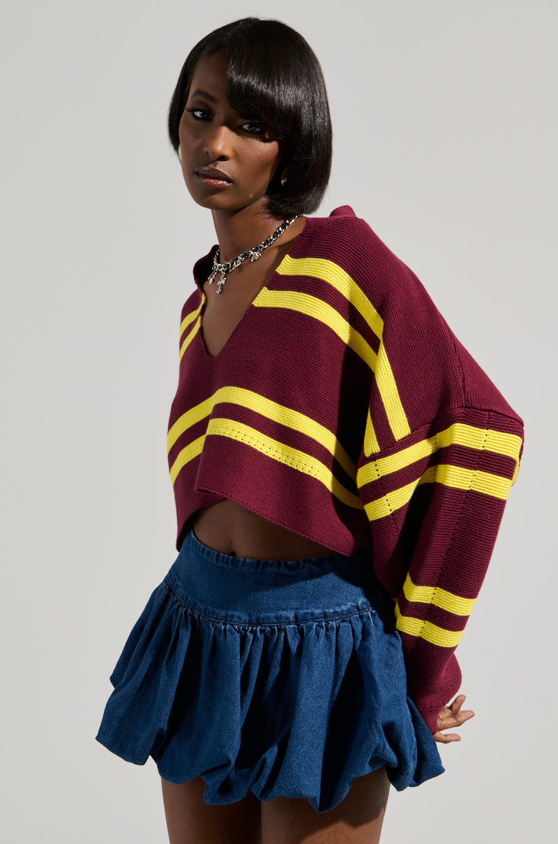 No time for losers in The AWNIS Label Winner Top. This cozy chic top is crafted from a stretchy. ribbed knit top and features a bold colorblock striped pattern. a foldover pointed collar. a plunging v-neckline. long sleeves. and unique dotted stitch detailing. Complete with a boxy. cropped silhouette. and an easy. pull-on fit. Pair with boyfriend jeans and sneakers for a finished look.