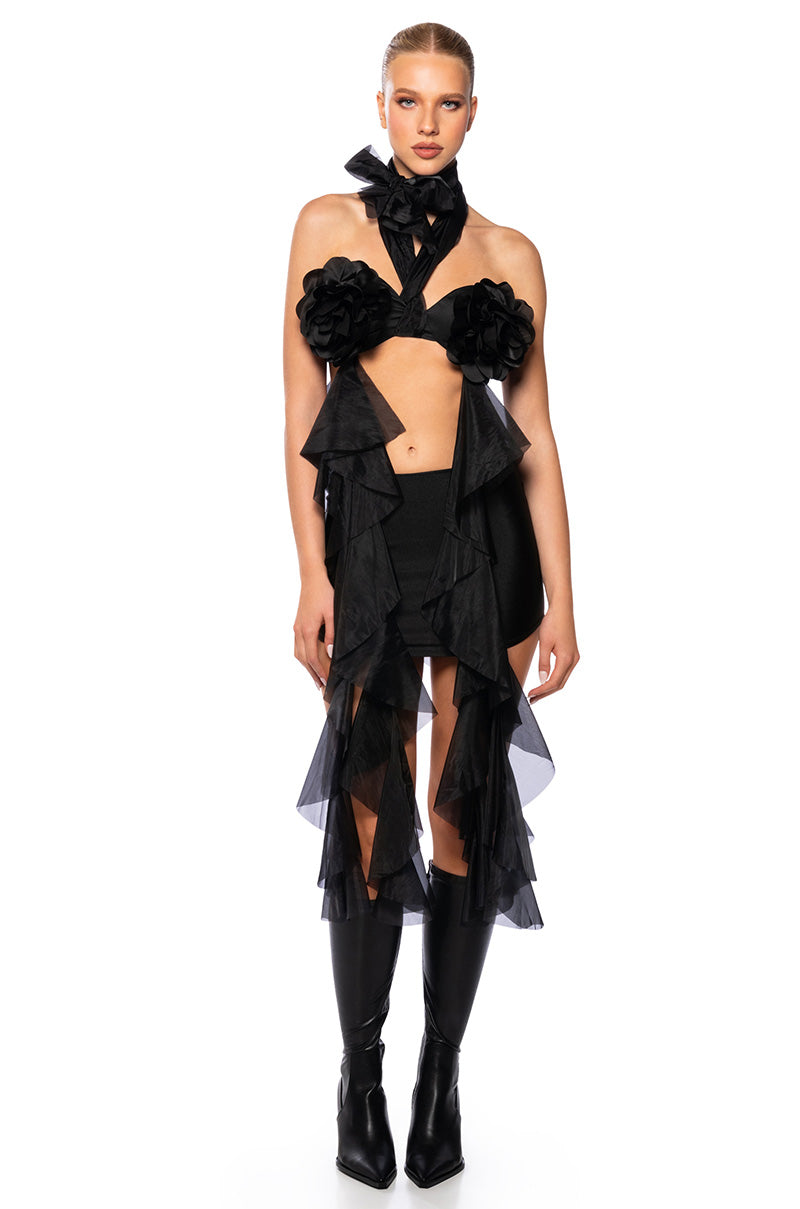 The AWNIS Label Your Eyes Only Ruffled Bra In Black is an ultra chic piece made from a non-stretch. luxe satin base fabrication. It features a chiffon self-tie halter neck. lightly padded satin cups. floral appliques at the bust. and a bralette silhouette. Complete with cascading sheer chiffon ruffle trim and a hook-and-eye back closure. Wear with a denim skirt and heeled boots for a post-worthy look.