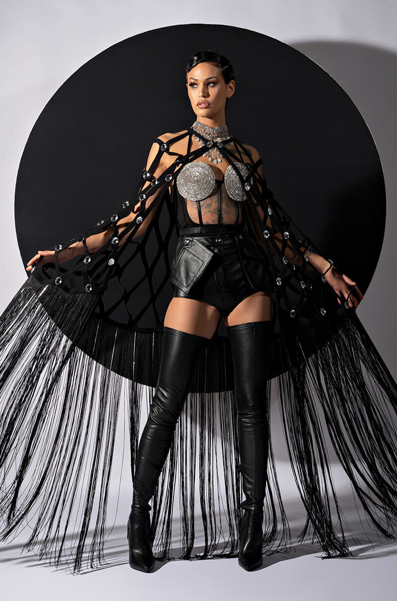 The AKIRA Label Mirror Ball Fringe Embellished Long Cardigan is made from a thick. netted ribbed knit fabrication and features a sleeveless longline silhouette. mirrored gem detailing. a fringed hem with rhinestone links. and discreet front hook and eye closures.