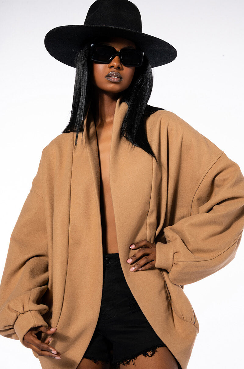 The AKIRA Label Airplane Mode Comfy Blanket Bomber is made from a cozy fabrication and features a foldover collar. long blouson sleeves with cuffed wrists and stitched detailing. a boxy silhouette. and an open front design. Layer this piece over any and all looks to cruise the skies with ease.
