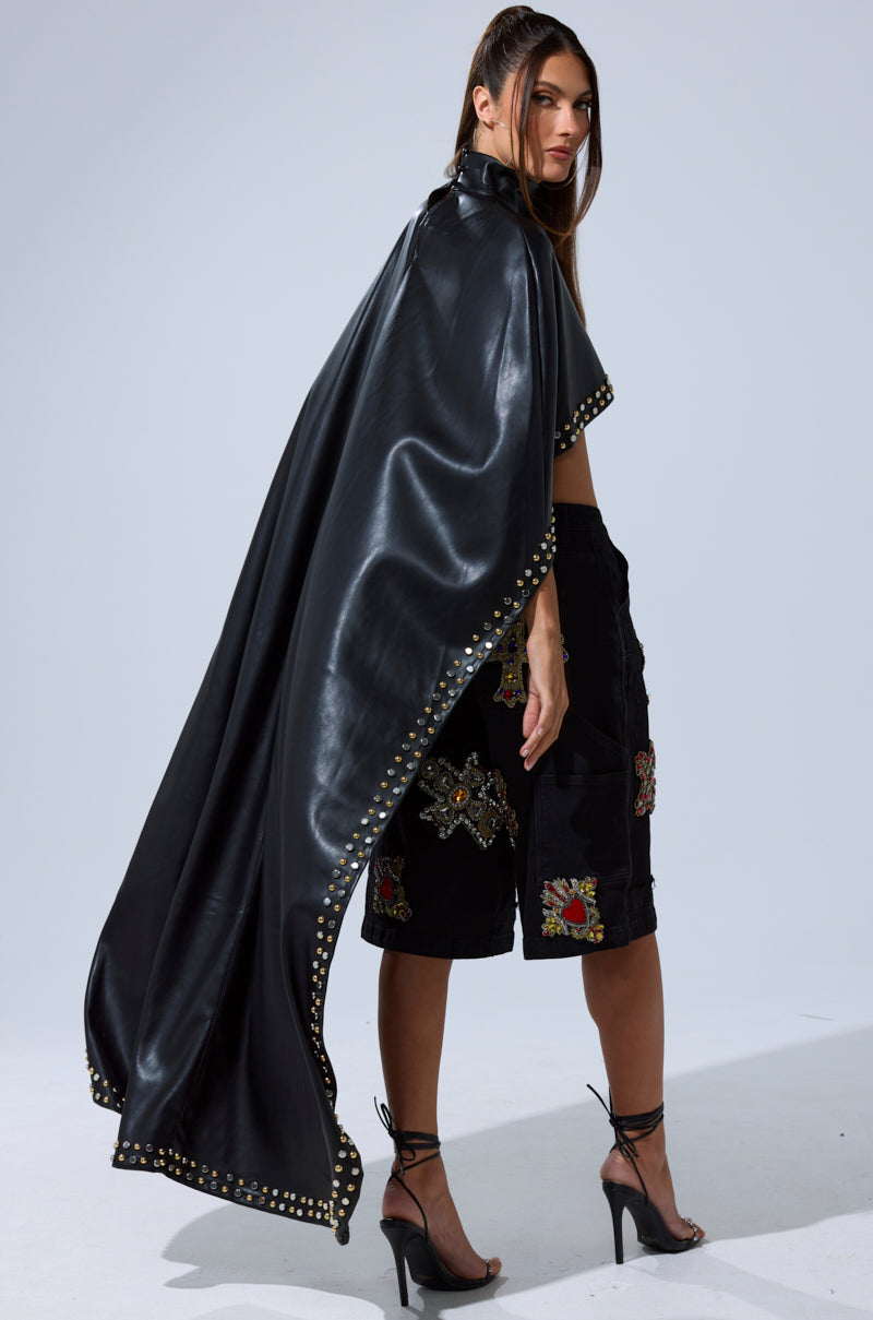 The AKIRA Label All About The Drop Turtleneck High-Low Blouse is a dramatic faux leather piece with a bold silhouette. It features a structured turtleneck and a cropped front that contrasts with an extended. floor-length back. Silver and gold stud detailing runs along the hemline and sides. adding edge to the sleek design. With its high-low cut and cape-like drape. this blouse is a standout piece built for strong. statement looks. Complete with tonal button closures at the nape of the neck.