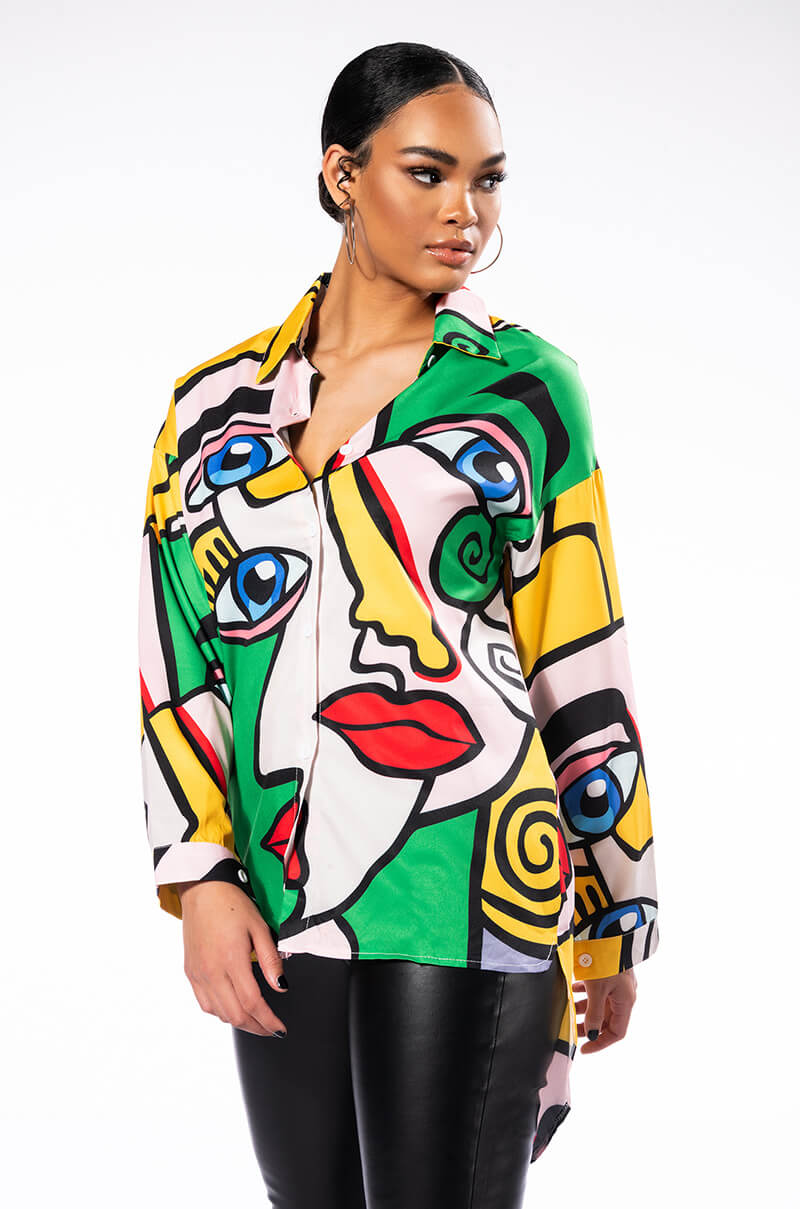 Give them something to look at with The AKIRA Label All Eyes On You Button Down Blouse! This bold piece is made from a lightweight cotton shirt fabrication and features an artsy faces print. a pointed collar. long sleeves with cuffed wrists. a rounded hem. mini length silhouette. and a button down front closure. Pair this piece with thigh high boots. denim. and a moto jacket to complete your graphic look.