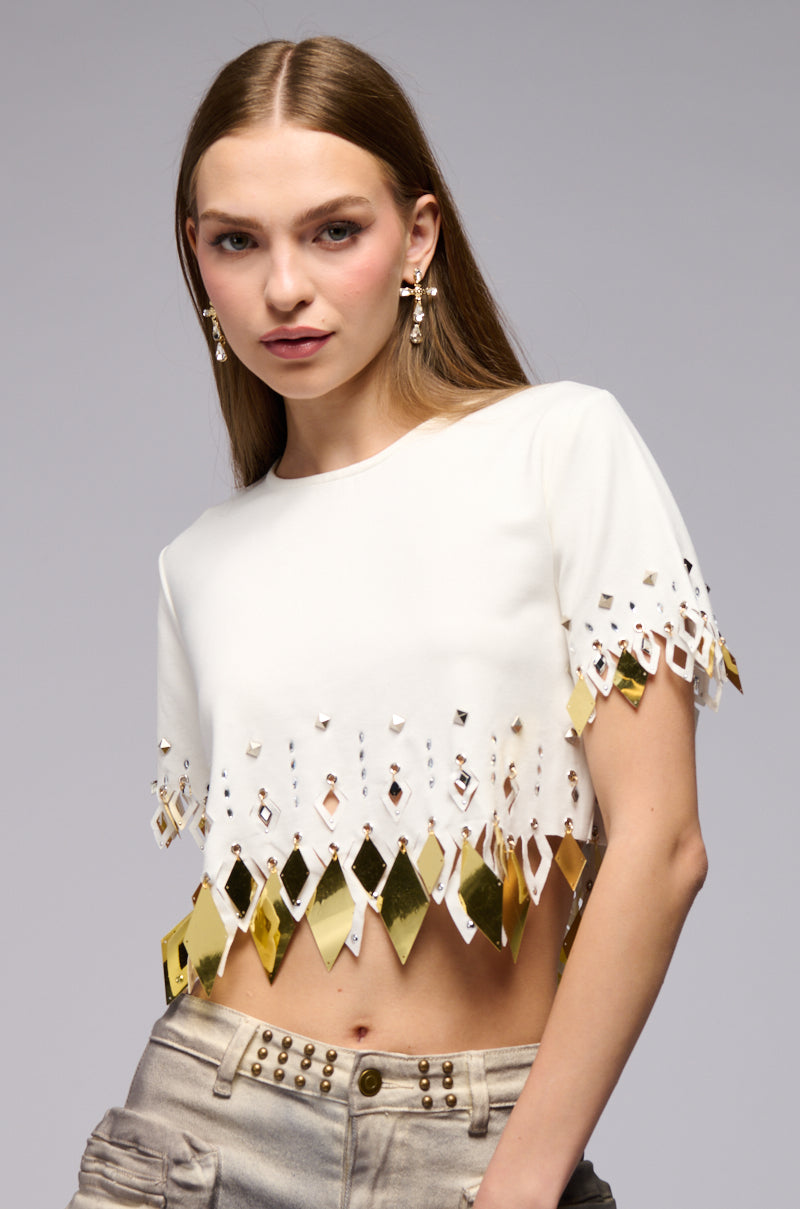Command the room in The AKIRA Label And It Goes Like This Tee. This luxe shirt is crafted from a stretchy cotton fabrication and features a crew neckline. short sleeves. a cropped cut. tonal stitching. and an easy. pull-on fit. Complete with a variety of shaped rhinestones. faux silver metallic pyramid studs. and dangling faux gold metallic diamond embellishments. with diamond cut out detailing and faux metallic silver grommets along the hemlines. Style with a mini skirt and heeled booties to catch the eye of everyone you pass.