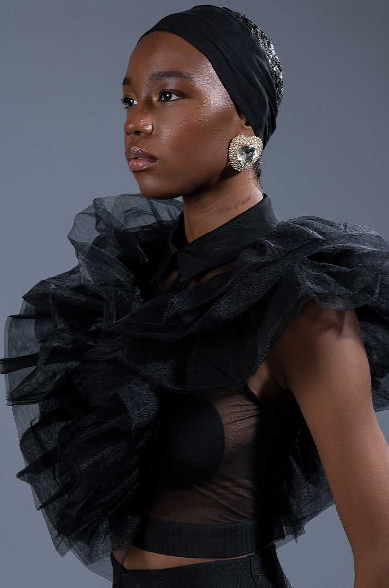 The AKIRA Label Flutter By Sleeveless Mesh Blouse is made from a sheer mesh fabrication and features a collared neckline. fabric trim along the hem and closure. dramatically layered tulle ruffles. and a button up front closure. Pair this piece with wide leg bottoms and booties for all the volume!