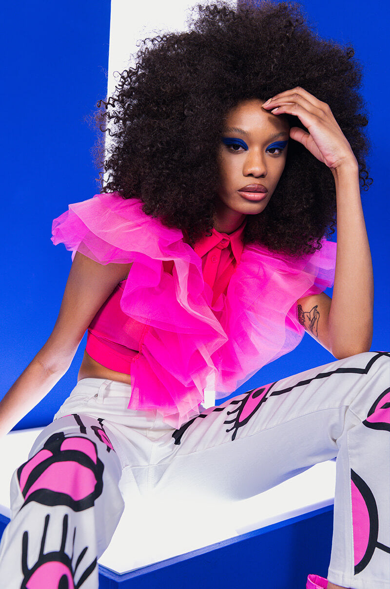 The AKIRA Label Flutter By Sleeveless Mesh Blouse is made from a sheer mesh fabrication and features a collared neckline. fabric trim along the hem and closure. dramatically layered tulle ruffles. and a button up front closure. Pair this piece with wide leg bottoms and booties for all the volume!