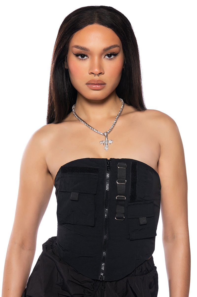 Feel the heat in The AKIRA Label Apply Pressure Cargo Corset Top In Black! This sexy piece is made from a slick nylon fabrication and features a rounded. strapless neckline. cargo flap pockets. boning for structure. Velcro and metal ringed strap detailing. polyester lining. a back lace-up enclosure. a pointed hem. and a cropped silhouette. Complete with an exposed front zipper closure.