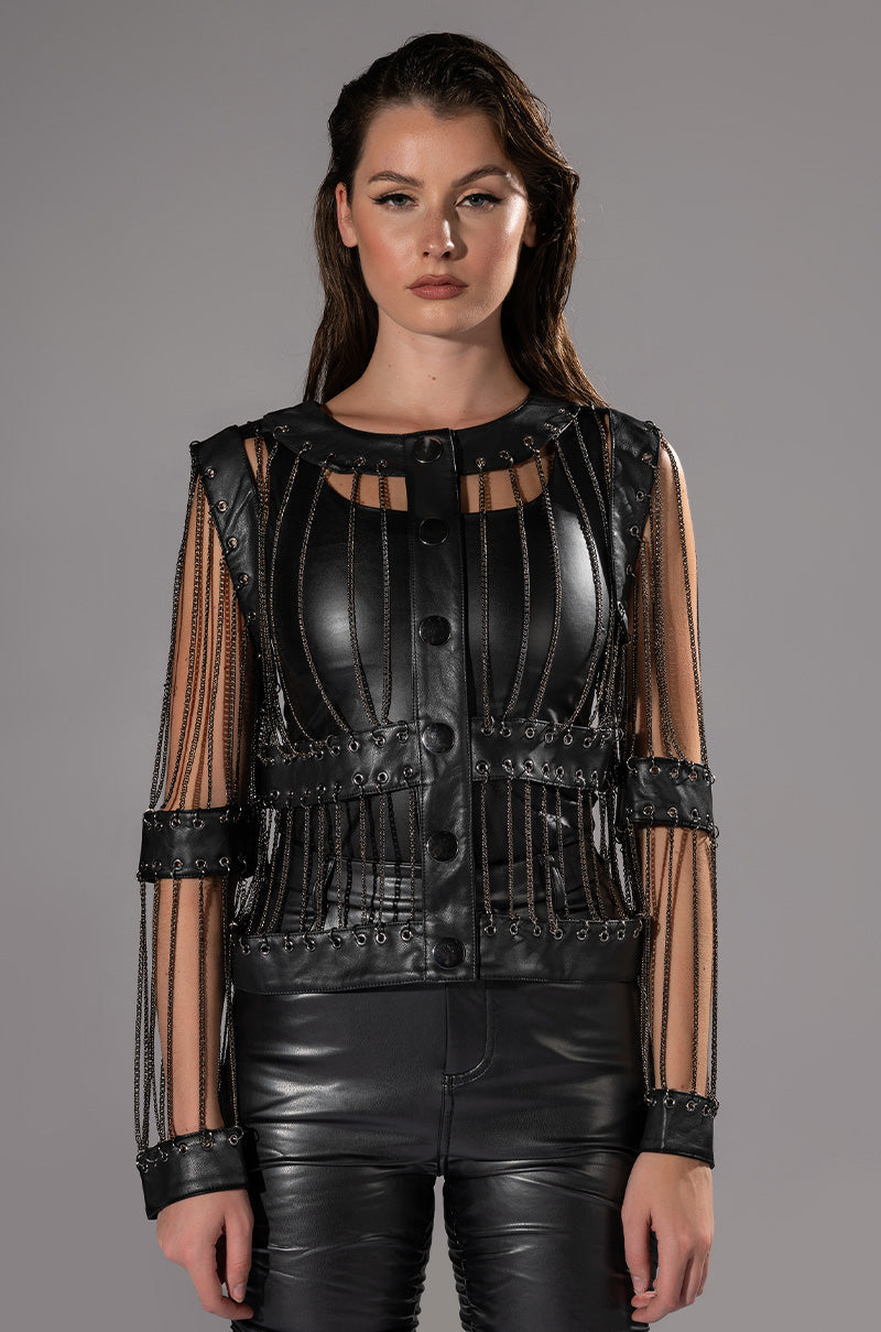 We've gotta link up! The AKIRA Label Together Again Chain Link Jacket features a structured vegan leather fabrication outlined in cascading hematite chains and grommets. a rounded collar. and long gold chain sleeves complete with a snap button front design. Style with a long sleeve tee and pleather leggings for a fully rocker look.