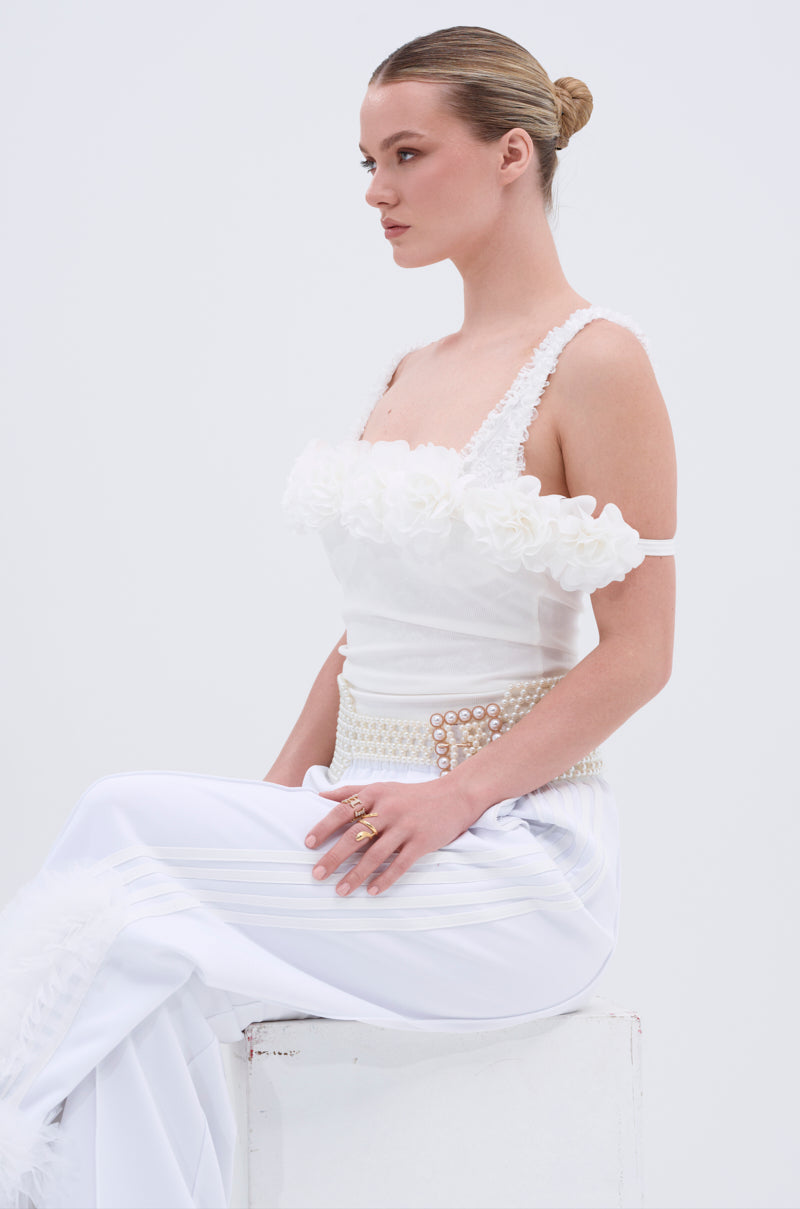 You'll radiate good vibes in The AKIRA Label Aura Floral Tank Top. This piece features a soft and stretchy ribbed knit base. a cropped. curve-hugging fit. a scoop neckline. and sturdy tank straps. It's complete with romantic. tonal floral appliques along the neckline and straps. Style it simply with straight-leg blue jeans and strappy white sandals for a clean. casual finish.