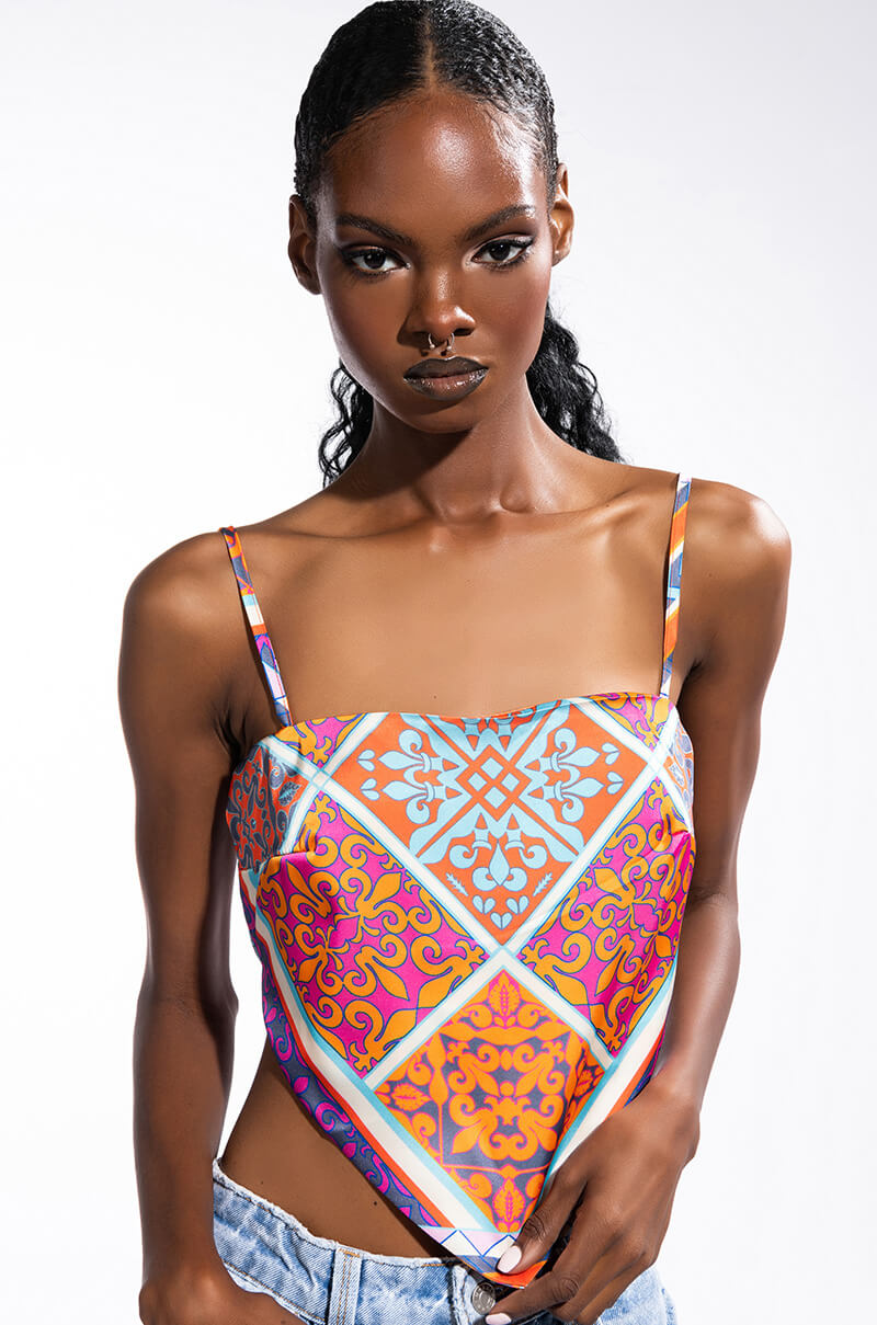 The AKIRA Label Chasing The Sun Scarf Tie Back Blouse features a soft satin fabrication. adjustable spaghetti straps. a straight across neckline. and all over baroque print patterning. Complete with a tie back design. a pointed hem. and a cropped cut. Style it with high rise jean shorts and strappy sandals for a chic brunch look!