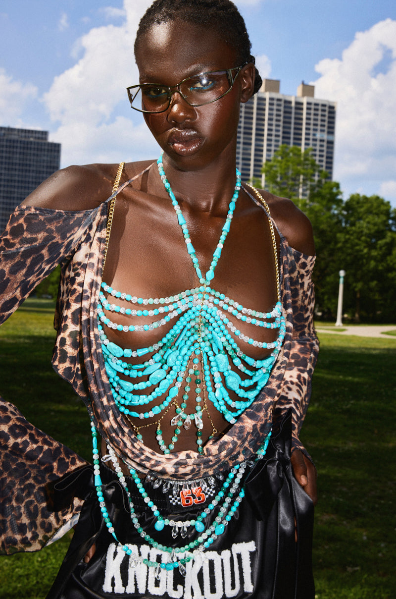 The AKIRA Label Beach Girly Bralette was made for sunsets and sandy days. Crafted from intricate. multicolor cascading strands of turquoise beads. clear crystals. and stone embellishments. this boho-chic bralette features a beaded halter neckline with an adjustable lobster clasp closure. coordinating gold-tone shoulder straps. and an artfully draped design on the bodice. Pair with wraps. maxi skirts. or your favorite bikini for a summer-ready finish.