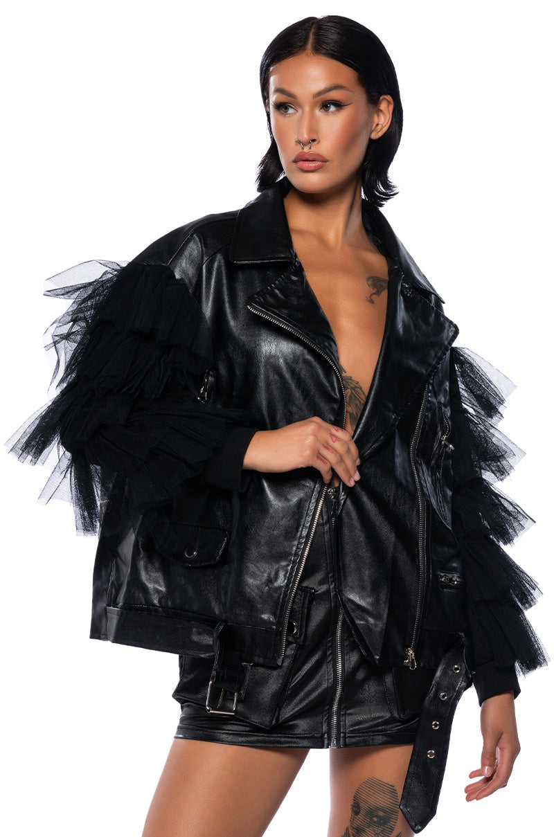 The AKIRA Label Burning Love Ruffle Moto Jacket is made from a non-stretch faux leather fabrication base and features a wide notch collar. long cotton bomber sleeves with tiered mesh ruffle detailing and ribbed knit cuffs. a mock flap pocket and zipper front pockets. light polyester lining. belt loops. and a coordinating. adjustable faux leather waist belt. Complete with a front zipper closure.