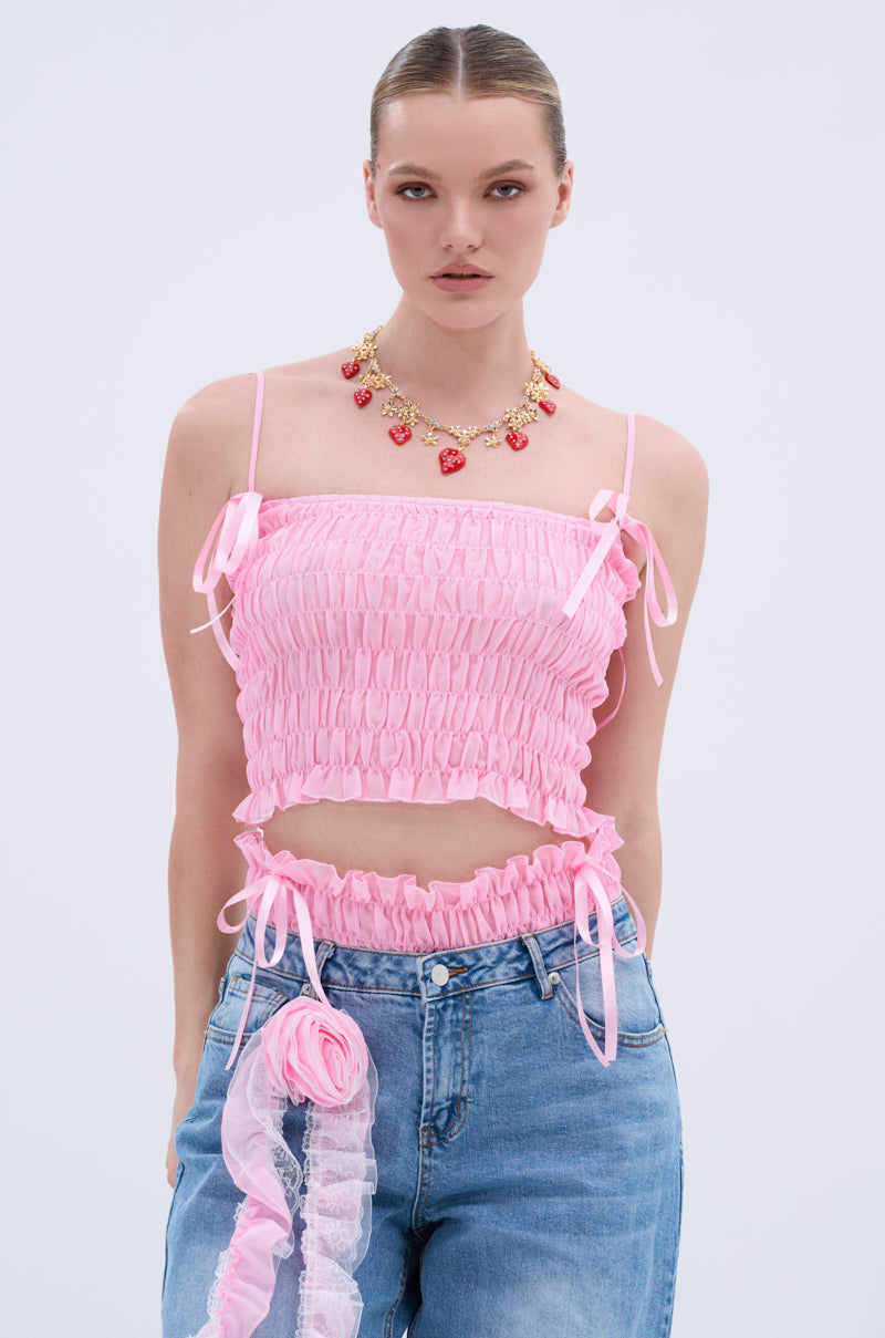 The AKIRA Label Called Me Ruched Bow Tank is the ultimate flirty-meets-feminine staple. Crafted from a sheer. smocked mesh. this sweet tank features a fully ruched bodice with a straight neckline. ruffled hemlines. adjustable think tank straps. and charming tonal satin bow accents at the base of the shoulders. Complete with a snug. cropped silhouette. and an easy pull-on fit. Style this piece with the matching AKIRA Label Call Me Relaxed Denim Pant With Ruffles. kitten heels. and a clutch for a darling finish.