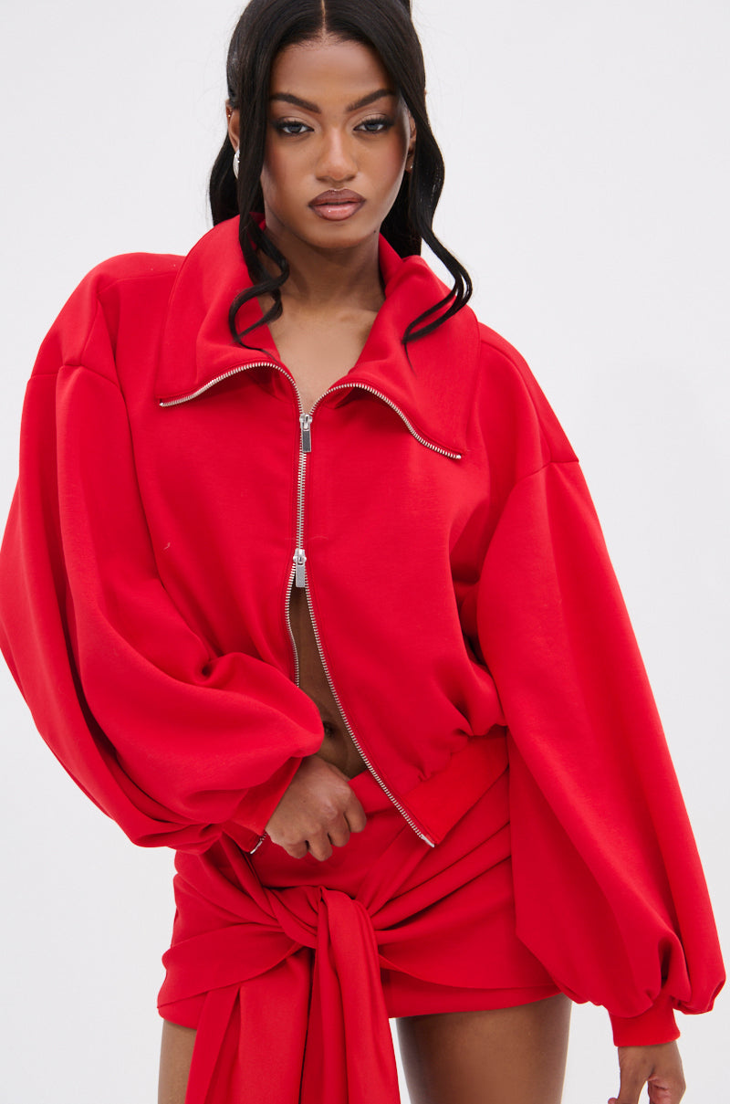 Be bold in The AKIRA Label Don't Be Shy Scuba Bomber. This casually cool jacket is crafted from a soft and stretchy scuba knit and features a cropped silhouette. a relaxed and slightly oversized fit. a large collar that can be worn standing-up or folded over. and a metallic zipper front closure. It's complete with long balloon sleeves with ruched detailing and cinched. ribbed cuffs. a ribbed hem. spacious waist pockets. and slick inner lining. Pair it with the coordinating Don't Be Shy Scuba Mini Skirt for a finished look.