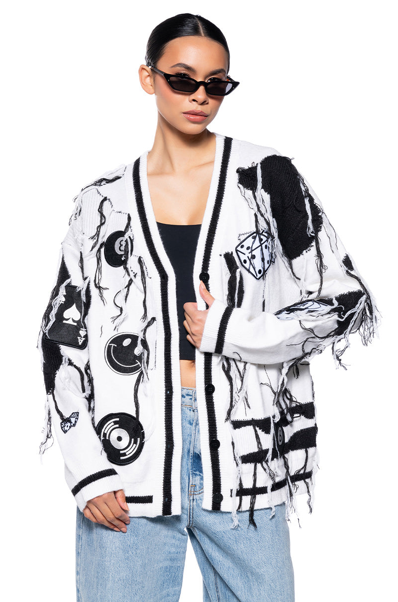 A gamble you won't regret! The AKIRA Label Don't Play Games Button Down Cardigan is made from a stretchy knit base fabrication and consists of a multitude of graphic game-inspired patchwork designs. including playing cards. dice. eight balls. and more. This cozy piece also features distressed fringe accents. ribbed knit striped trim detailing. long sleeves. a plunging neckline. and a slouchy. oversized cardigan silhouette. Complete with a button up closure. Consider styling with a black skater dress. tights. and platform loafers for a trendy ensemble.