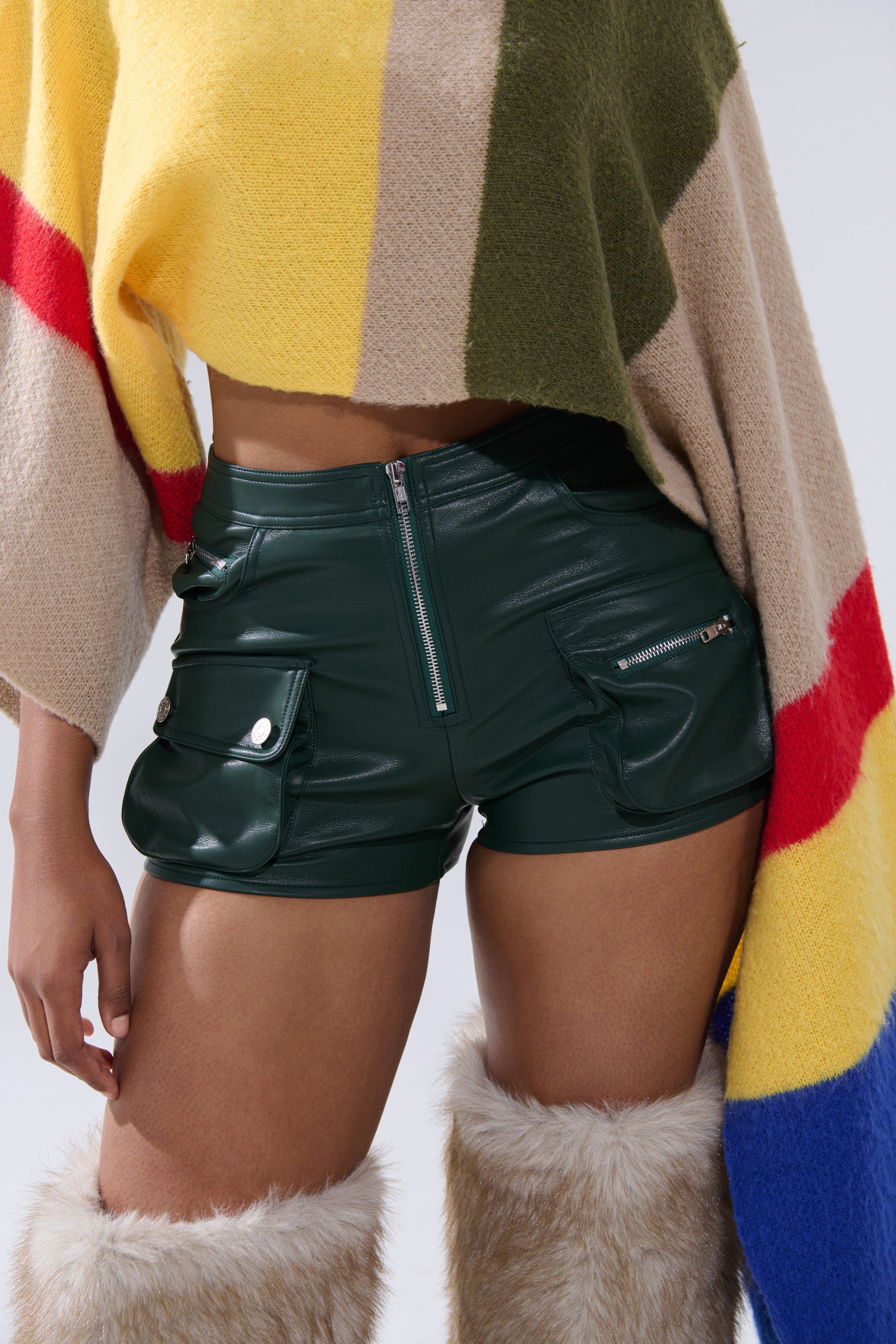 Cargo meets couture with The AKIRA Label Faux Leather Mini Cargo Shorts. Crafted from sleek faux leather. these shorts boast a high-waisted fit. utilitarian-inspired details including cargo side pockets with snap-button closures and zipper accents. dual waist pockets and zippered rear pockets. a front zipper closure. and silver-tone hardware. Complete with a curve-hugging. mini-length silhouette. Style with oversized tees for casual cool or paired with a crop top and boots for a night out.