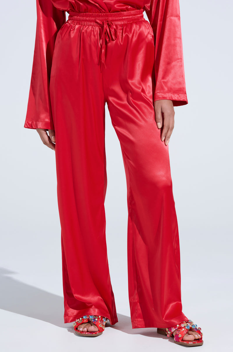 The AKIRA Label Hold Onto Me Trouser is too good to let go! Crafted from luxurious semi-stretchy satin. these bottoms feature a high-rise fit. a shirred elastic waistband with drawstring closures. side slant waist pockets. and a flowy wide leg silhouette. Style it with the matching AKIRA Label Hold On To Me Trouser. kitten heels. and chunky hoop earrings for a polished look.
