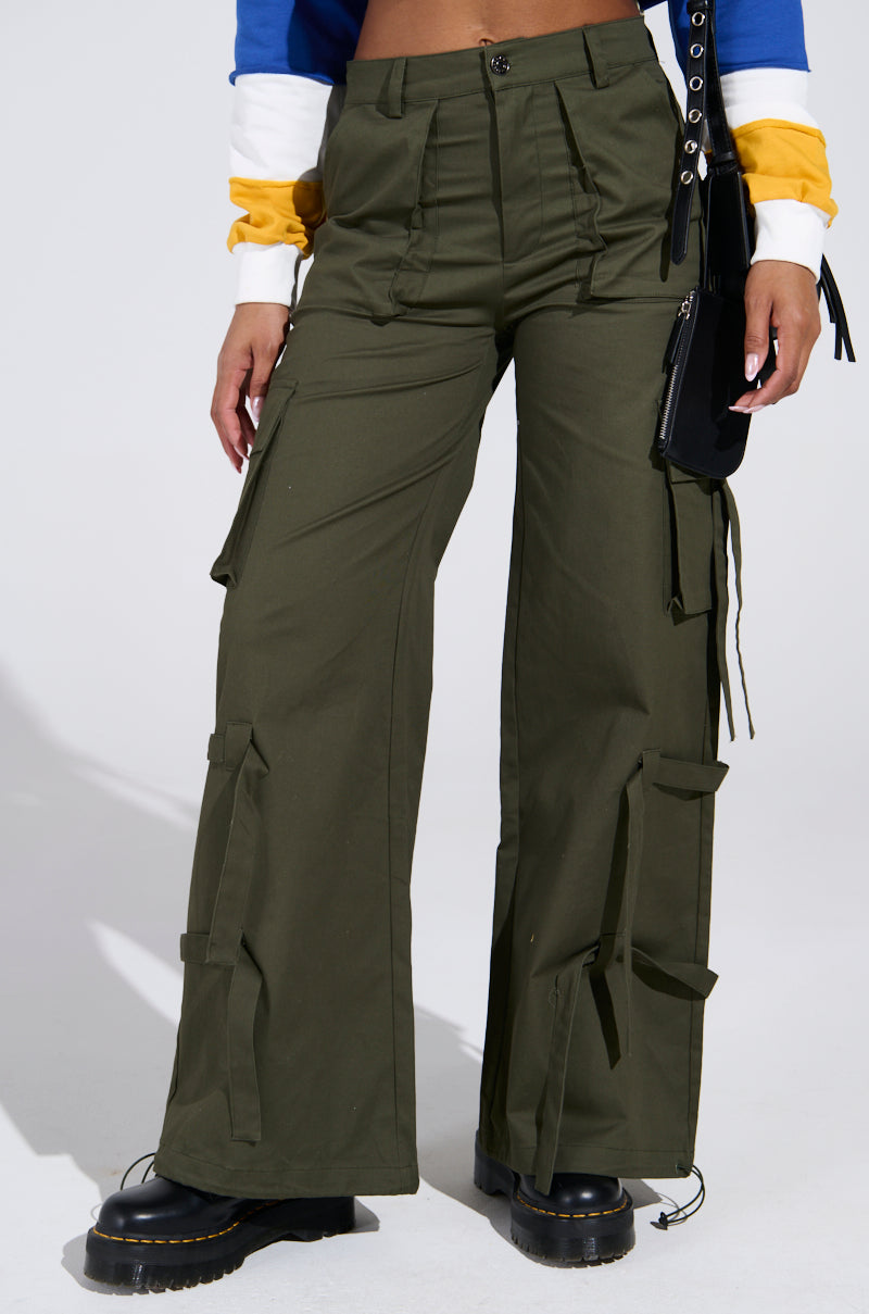 You know what they say about trends. The AKIRA Label It Is Back Cargo Pants are made from a smooth cotton blend fabrication and feature a high rise waist. belt loops. slant side pockets. cargo thigh and back pockets. and adjustable toggle trim drawstring hems. Complete with a classic front button and zipper closure and toggle drawstring hem detailing. Pair this piece with a cropped tee and loafers to finish off your amped-up casual look.