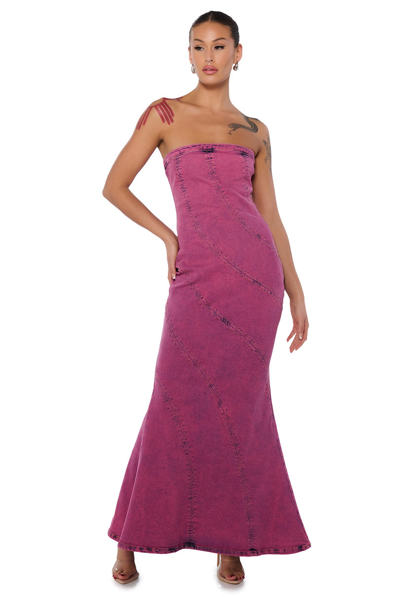 She's giving Barbie core in The AKIRA Label Lets Go Party Denim Midi Dress! Brought to you in a stretchy. cotton blend denim base fabrication. this flirty piece features a strapless rounded neckline. contour seaming. a hip-hugging silhouette. and a slightly flared mermaid hem. Complete with a midi length. and a faux silver metallic back zipper closure. Finish off your look with pointy-toed booties and a pink clutch.