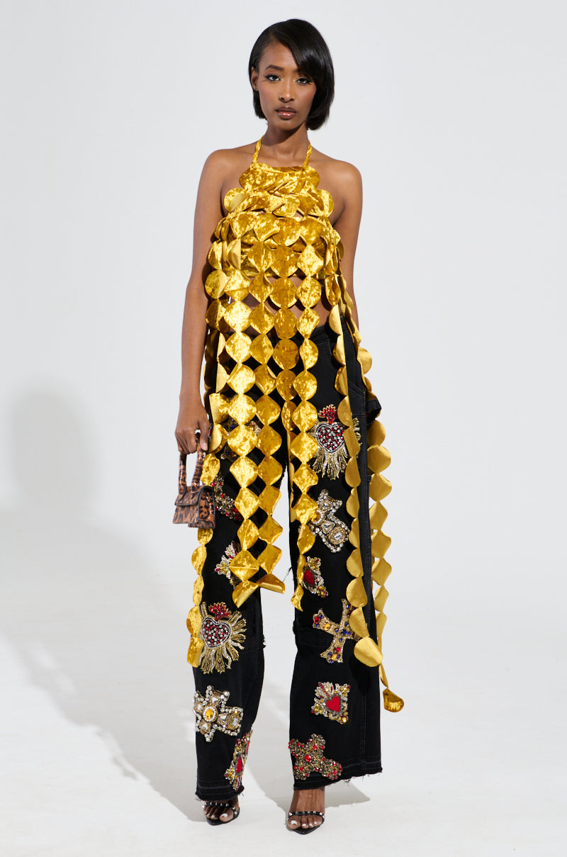 Time to let loose in The AKIRA Label Lights Flashing Halter Tie Neck Top. This party-ready piece is crafted from an opulent. crushed velvet fabrication and features self-tie thin halter straps. a sleeveless design. an attached bandeau with inner elastic trim and a satiny lining. and coordinating. wispy circular accents that cascade to the knees. Complete with a metallic back zipper closure. and an easy. slip-on fit. Pair this top with wide leg denim. stilettos. and a clutch to be center stage.