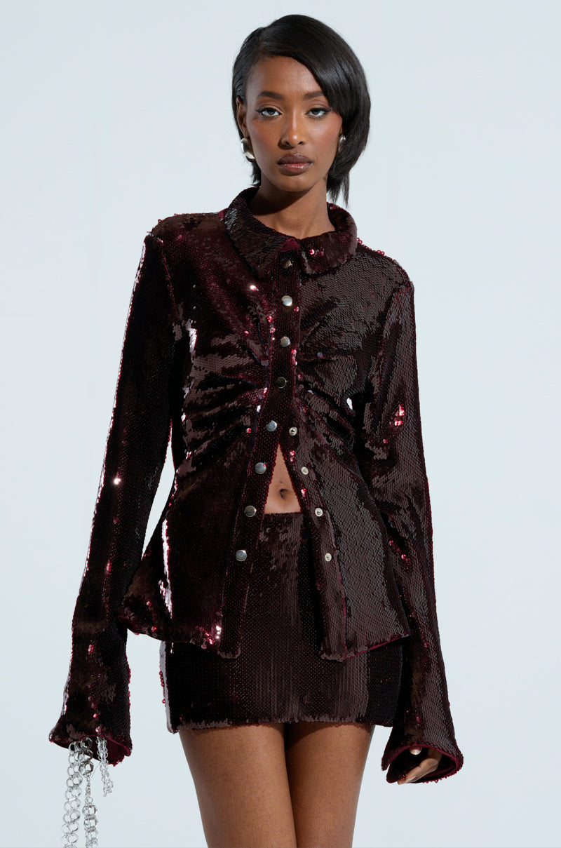 After hours kinda vibes in The AKIRA Label Lights Out Button Down Blouse. This glitzy. holiday-esque top is crafted from a double-lined. stretchy mesh base and features a pointed collar. long sleeves with slits at the bottom hems. flattering ruched detailing at the center of the bodice for a cinched look. metallic snap-button front closures. and a silky inner lining. Complete with a fitted. longline silhouette. Pair with the matching AKIRA Label Lights Out Mini Skirt. sheer tights. and stilettos for a sultry. festive look.