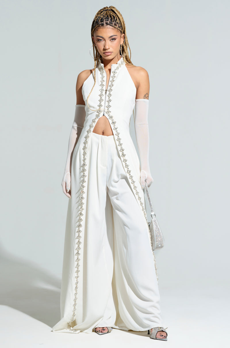Ice-queen approved. The AKIRA Label On It Top is a stand-out piece crafted from a smooth. semi-stretchy polyblend. It features a dramatic. curve-skimming. maxi-length silhouette. a sleeveless design. a mock neckline. and a midriff-high front split seam opening. Complete with a metallic zip front closure. a satin-lined interior. and chunky. sparkling silver rhinestone embellishments that trim the entire garment.