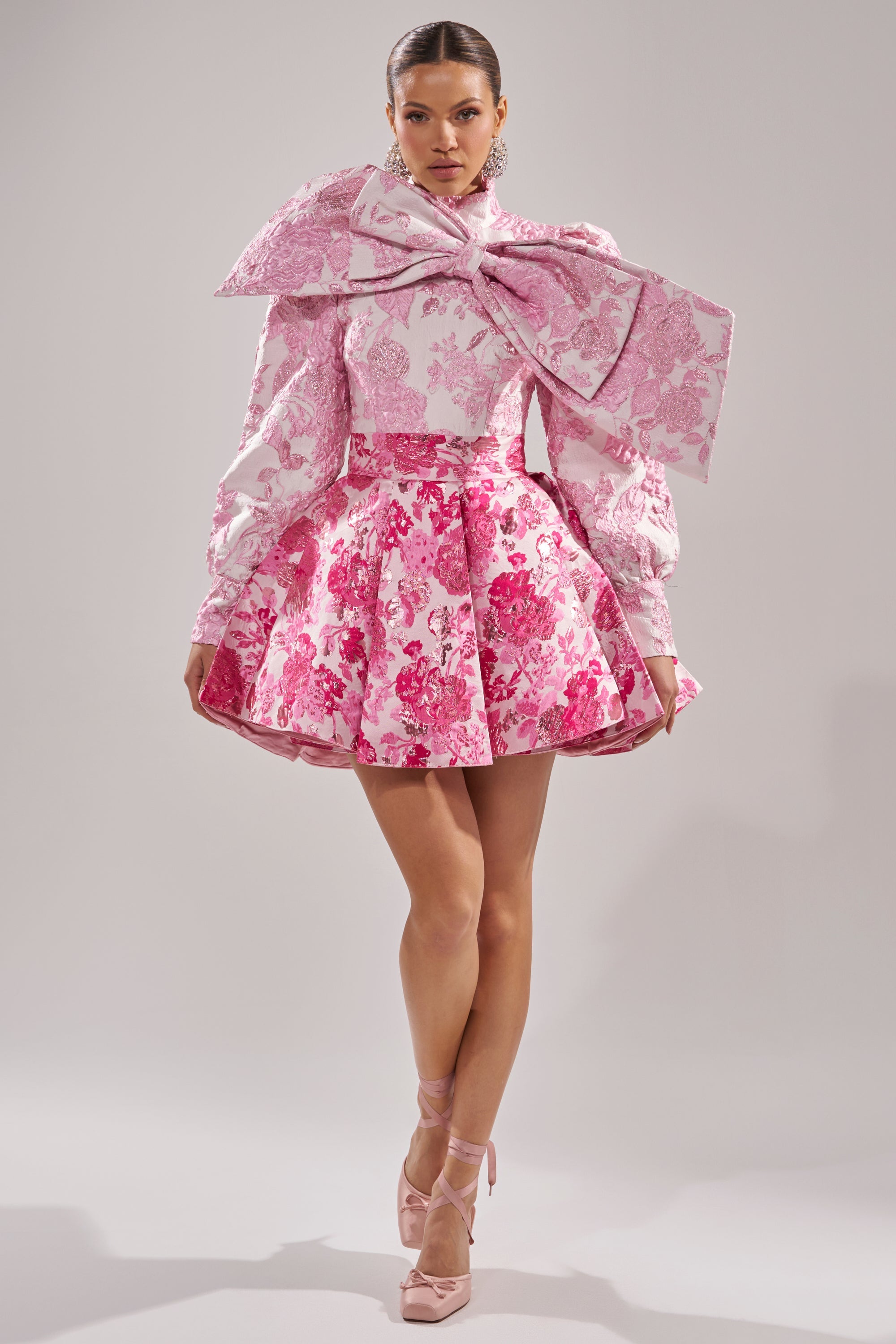 Live like royalty in The AKIRA Label Renaissance Two-Tone Brocade Mini Dress in Pink. A maximalist's dream. this mini dress is crafted from two coordinating floral jacquards that blend soft blush tones with saturated rose and magenta hues. The high neckline is crowned with an oversized sculptural bow that adds ultra-feminine flair. while voluminous puff sleeves add regal drama. A structured waist gives way to a full. pleated mini skirt that flares out with statement volume. Finished with a hidden back zipper and satin lining. this dress delivers both visual impact and couture-inspired detail.