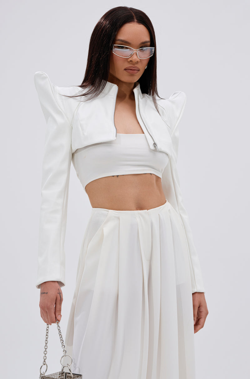 The AKIRA Label Taking Names Moto Bolero is a cropped moto-style jacket crafted from supple faux leather featuring an exaggerated. architectural design with a sleek mock collar. long sleeves with structured. pointed hemlines and zippered cuffs. and a metallic front zip closure. Complete with an ultra-cropped silhouette. Pair with low-rise. flared denim and stiletto booties for a finished look.