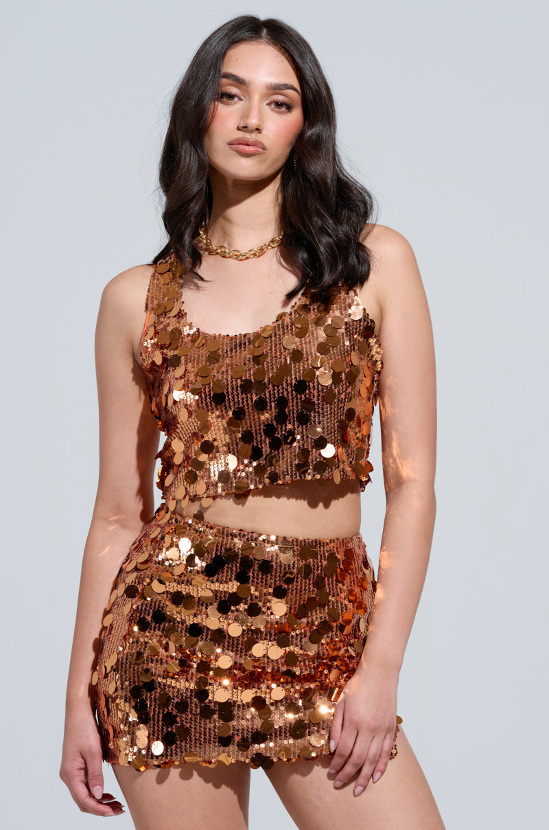 Light up the dance floor in The AKIRA Label Yours Truly Top. This dazzling tank is crafted from a stretchy. lightweight poly-blend covered in tonal sequin discs. big and small. It features a cropped. sleeveless fit. racerback tank straps. and smooth interior lining. Wear it with the complementary Yours Truly Mini Skirt. platform heels. and oversized hoop earrings for a disco diva-approved look.